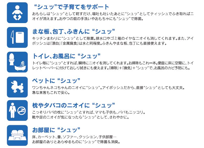 ・生活の様々な場面で気軽に噴霧していただけるだけで、《瞬間消臭》《ウイルス除菌》《アレルギー物質・カビ原因菌の除去》が期待できます。